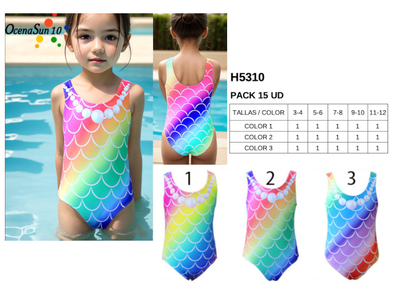 Este bañador de una pieza para niñas deslumbra con su estampado de escamas en colores degradados y un diseño frontal que simula un collar de perlas. Inspirado en el estilo sirena, su corte clásico y cómodo permite moverse con libertad mientras aporta un look mágico y lleno de color. Ideal para verano, juegos acuáticos o sesiones de fotos divertidas.