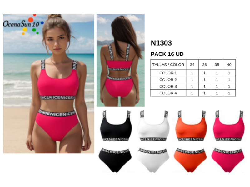 Conjunto de bikini juvenil con diseño deportivo, compuesto por top con escote redondeado y tirantes anchos para mayor sujeción, acompañado de una braguita de cintura alta. Ambos con banda elástica decorativa con texto “NICE” en contraste que aporta un look moderno, urbano y dinámico. Disponible en cuatro colores sólidos: ideal para jóvenes que buscan estilo y comodidad tanto en la playa como en la piscina.