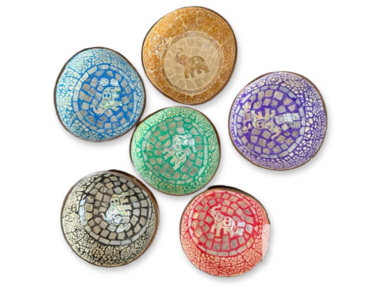 Cuencos de coco con acabado interior en mosaico efecto craquelado y figura de elefante grabada en el centro. Cada unidad presenta un color diferente: azul, rojo, verde, dorado, morado o negro. Una propuesta original y exótica para decorar, regalar o coleccionar.