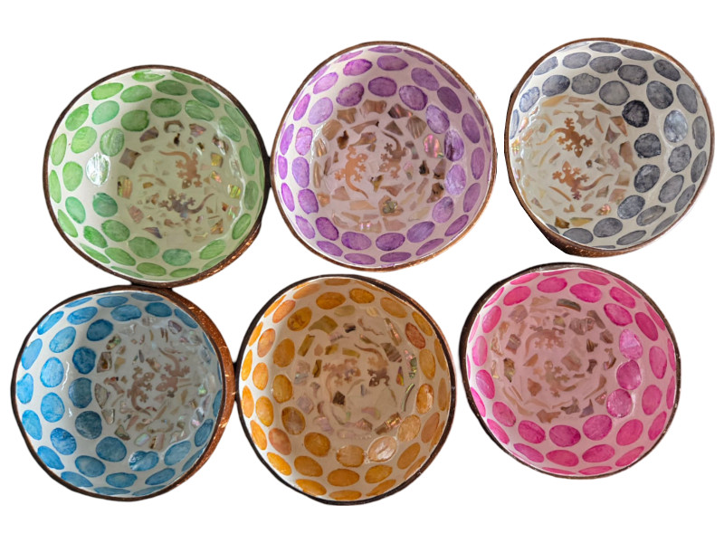 Cuencos de coco con decoración interior de óvalos en colores brillantes dispuestos en forma circular sobre fondo nacarado. Cada unidad presenta un color distinto: verde, lila, negro, azul, rosa y naranja. Su estética moderna y luminosa los convierte en un complemento decorativo ideal para cualquier ambiente.
