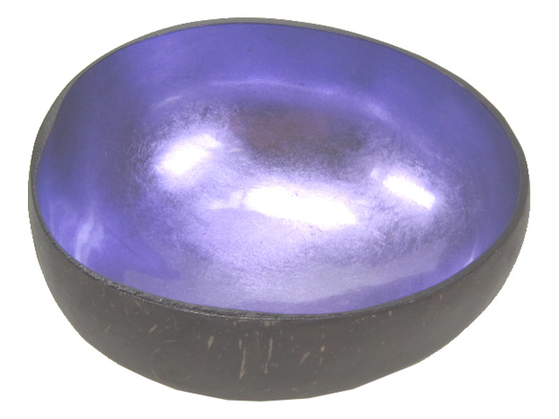 Cuenco decorativo de coco con interior liso en un brillante color violeta metalizado. Ideal para dar un toque moderno y colorido a cualquier espacio.