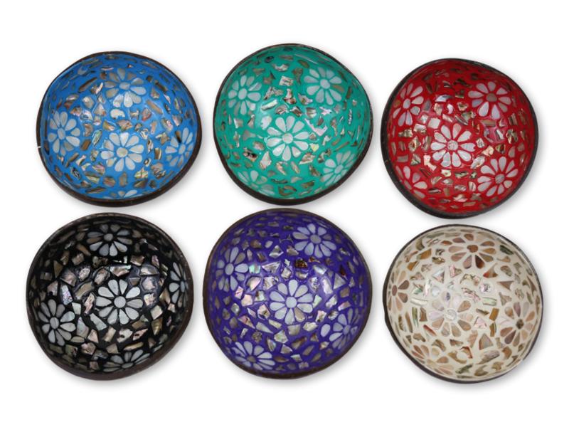 Cuencos de coco con diseño floral calado en tonos vivos, combinados con incrustaciones de nácar que resaltan el fondo de colores como azul, turquesa, rojo, negro, violeta y crema.Pack: 6 unidades