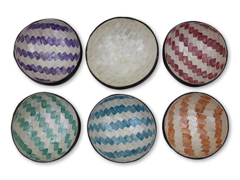 Cuencos decorativos elaborados con incrustaciones de nácar dispuestas en patrón de espiga, combinadas con colores intensos como morado, burdeos, turquesa, azul, naranja y blanco natural.