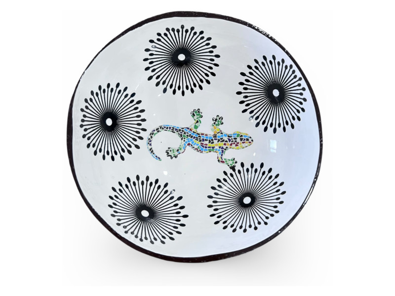 Cuenco de coco con fondo blanco decorado con una figura central de lagarto en mosaico de colores y cinco motivos florales negros de estilo gráfico. Su diseño simétrico y contemporáneo lo hace perfecto como pieza decorativa llamativa o regalo con un toque artístico.