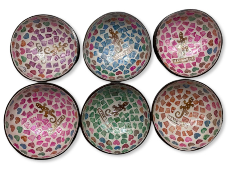 Cuencos decorativos hechos a mano con interior de mosaico en forma de corazones de colores. Cada pieza lleva una figura de lagartija y la palabra Mallorca en nácar, ideal como recuerdo o detalle decorativo.