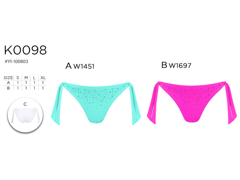Tanga de bikini con laterales amplios anudados, diseñado para ofrecer un ajuste favorecedor y estilizado. La parte frontal está decorada con cristales brillantes que añaden un toque sofisticado y juvenil. Perfecto para destacar en la playa o la piscina.