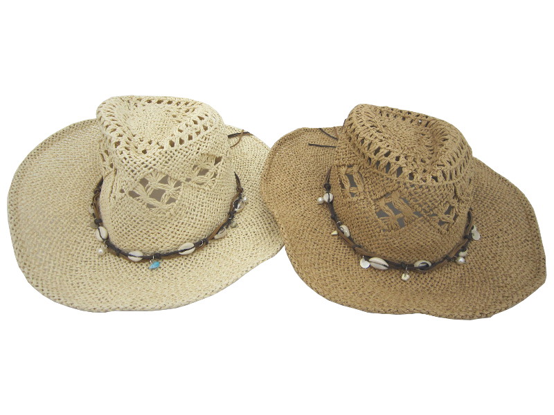 Sombrero estilo cowgirl en tejido trenzado calado, decorado con una cinta de cuerda y pequeñas conchas naturales. Perfecto para un look veraniego, playero o de festival. Diseño fresco y ventilado gracias al trenzado abierto.