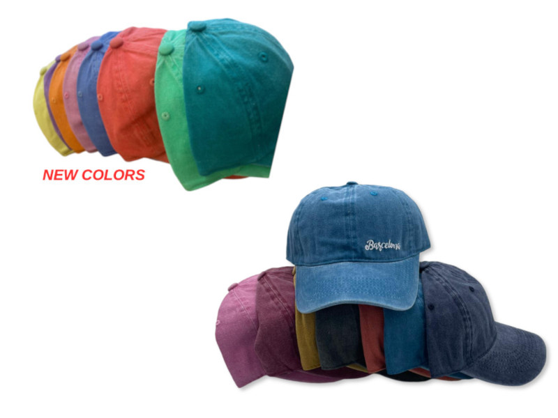 Gorras con la palabra “Barcelona” bordada en el frontal, disponibles ahora en nuevos colores combinados como menta, coral, lila, azul, rojo, amarillo y más. Diseño casual con tejido lavado, visera curva y ajuste trasero. Perfectas como recuerdo o complemento urbano.