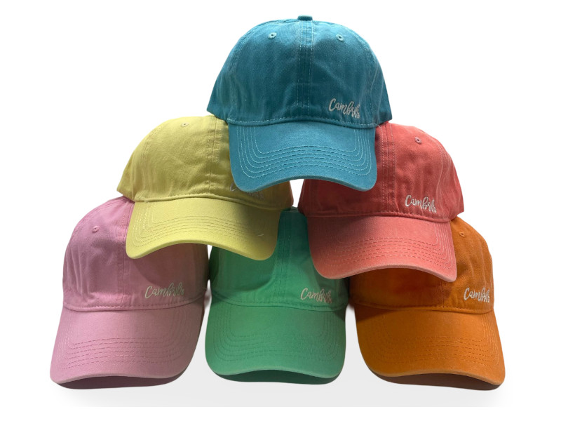 Pack de 24 gorras con bordado “Cambrils” en tipografía manuscrita, confeccionadas en algodón lavado con tonos pastel vibrantes: turquesa, rosa, verde, coral, amarillo y naranja. Diseño juvenil y fresco ideal para merchandising turístico o tiendas de souvenirs. Ajuste trasero regulable que se adapta cómodamente a cualquier talla.