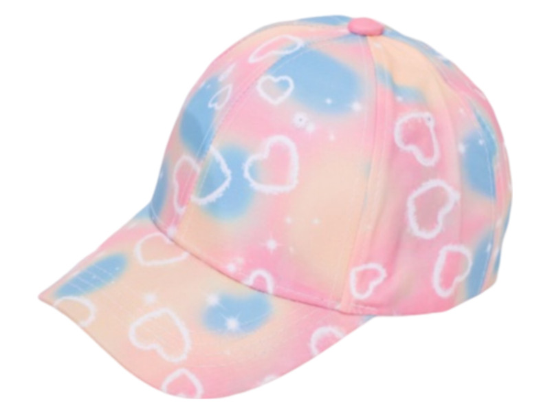 Colores suaves y dulces para las más soñadoras. Esta gorra infantil combina un estampado de corazones sobre tonos pastel en rosa, azul y melocotón, aportando un look alegre y tierno para el verano.