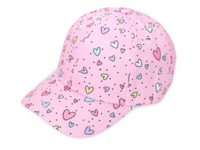 Gorra infantil tipo béisbol con fondo rosa y estampado de corazones en colores pastel, perfecta para un look alegre y veraniego.