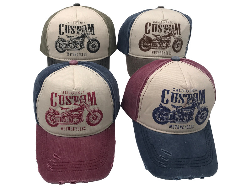 Gorras estilo vintage con visera desgastada y diseño frontal “California Custom Motorcycles”. Disponibles en varias combinaciones de colores con efecto envejecido. Ajustables, cómodas y con personalidad, ideales para amantes del estilo biker o urbano. Vienen en 4 colores surtidos.