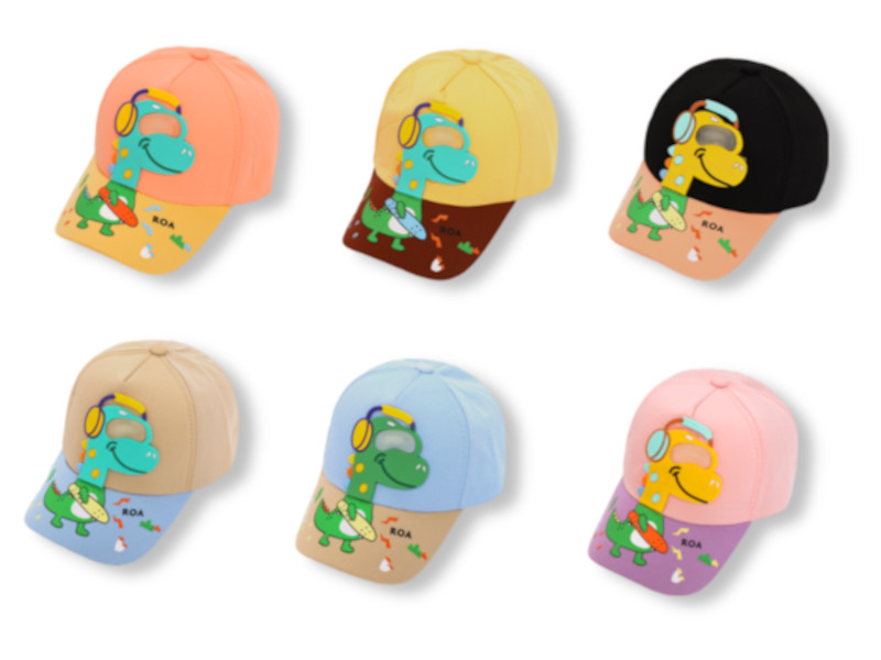 Divertida gorra infantil con diseño de dinosaurio moderno que lleva gafas y auriculares, en una variedad de colores vibrantes y combinaciones llamativas.