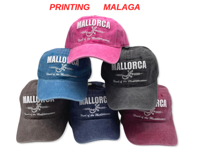 Pack de 24 gorras con diseño «Málaga» bordado. Modelo de algodón lavado con acabado desgastado, cierre ajustable metálico y tonos sobrios que incluyen gris, azul, vino y negro. Ideal para tiendas de souvenirs en destinos turísticos.