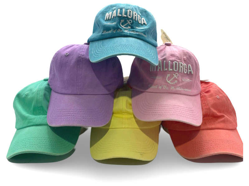 Gorras con diseño bordado “Mallorca – Heart of the Mediterranean” acompañado de un ancla en el centro. Disponibles en colores neón como turquesa, rosa, lila, coral, amarillo y verde menta. Ajustables y ligeras, perfectas como recuerdo o accesorio veraniego.