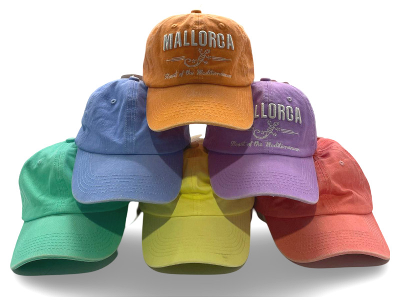 Gorras con bordado frontal “Mallorca – Heart of the Mediterranean” y lagarto decorativo. Disponibles en colores vivos y veraniegos como naranja, lila, coral, azul, verde y amarillo. Ajustables, ligeras y perfectas como recuerdo colorido de la isla.