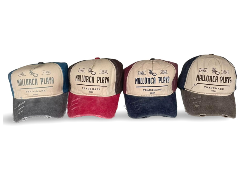 Gorras con diseño “Mallorca Playa Trademark 2000” en el panel frontal, combinadas en tonos beige con viseras desgastadas y laterales en colores como rojo, azul, gris y marrón. Estilo retro y casual, perfectas como recuerdo o accesorio urbano.