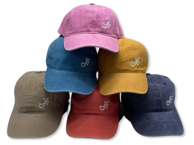 Gorra de estilo lavado con pequeño bordado de lagartija al frente. Diseño desenfadado y colores variados con efecto desgastado. Incluye 24 unidades en tonos tierra y mediterráneos.
