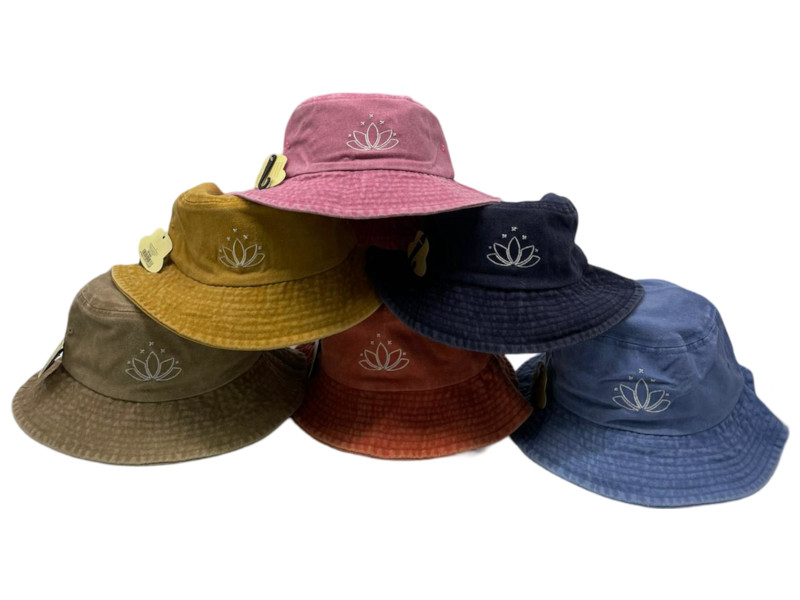 Gorro bucket de efecto lavado en colores variados, decorado con un bordado de flor de loto con estrellas. Estilo relajado y bohemio, ideal para outfits casuales o playeros.