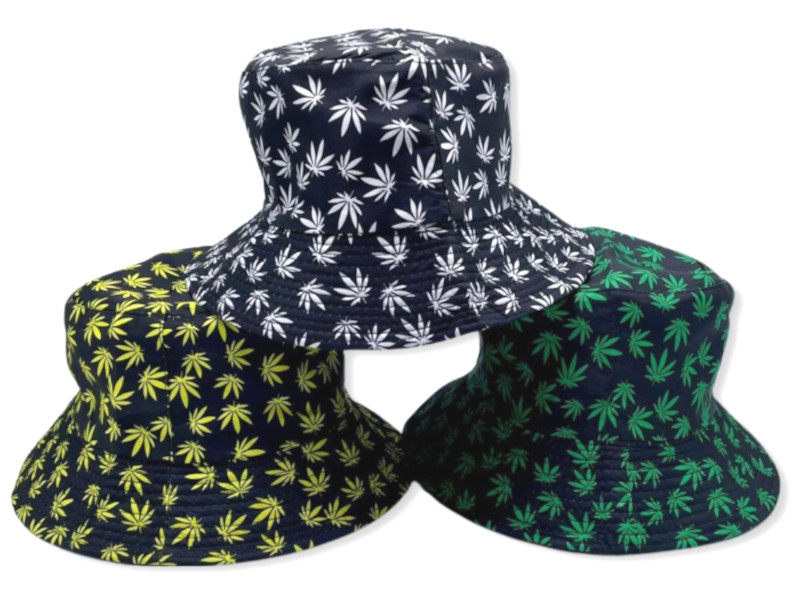 Gorro tipo bucket con estampado de hojas en colores variados. Diseño atrevido y llamativo, ideal para looks urbanos, festivales y verano.