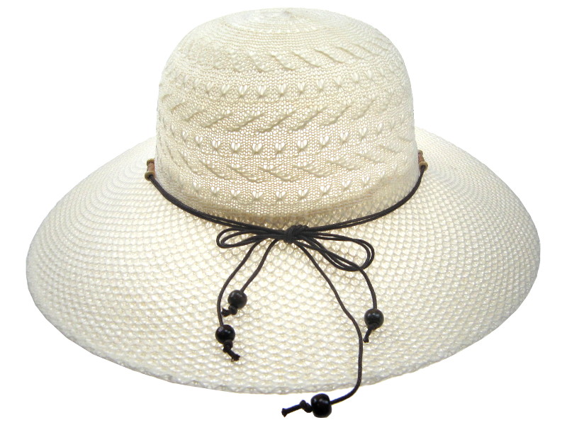 Pamela de ala ancha en color blanco, elaborada en material calado que ofrece una excelente ventilación y protección contra el sol. Adornada con un fino cordón marrón rematado en cuentas negras, formando un delicado lazo en la parte trasera. Ideal para complementar tus looks de verano en la playa, el jardín o eventos al aire libre. Pack de 12 unidades.