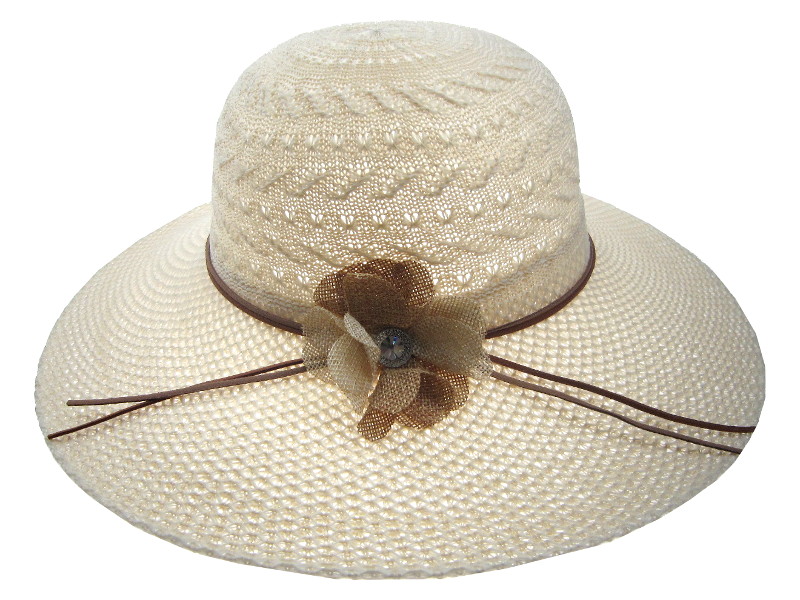 Pamela de ala ancha en tono beige natural, confeccionada en material calado que proporciona frescura y protección solar. Decorada con una delicada flor de organza en tonos tierra y una cinta marrón que recorre el contorno, ofreciendo un look sofisticado y natural para el verano. Ideal para la playa, el jardín o cualquier evento al aire libre. Pack de 12 unidades.