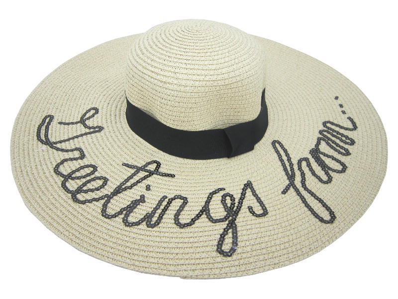 Pamela de ala extra ancha en color beige natural, confeccionada en material trenzado de alta calidad. Decorada con una elegante cinta negra y la inscripción «Greetings from…» bordada en hilo oscuro, ideal para darle un toque divertido y chic a tus días de playa o paseo. Perfecta para protegerte del sol con estilo. Pack de 12 unidades.