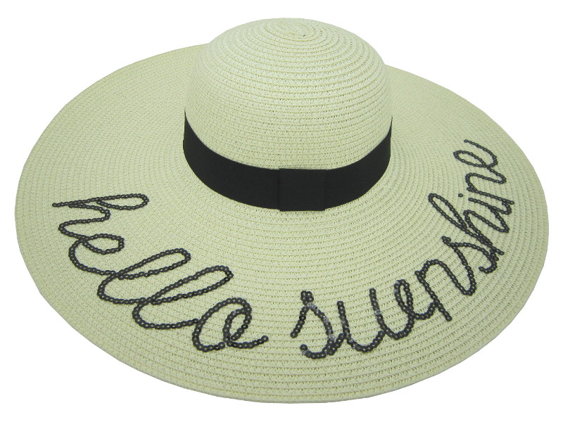 Pamela de ala ancha confeccionada en material trenzado natural, perfecta para días soleados. Lleva una elegante cinta negra y la frase bordada «Hello Sunshine» en hilo oscuro que le aporta un toque alegre y sofisticado. Ideal para protegerse del sol con mucho estilo. Pack de 12 unidades.