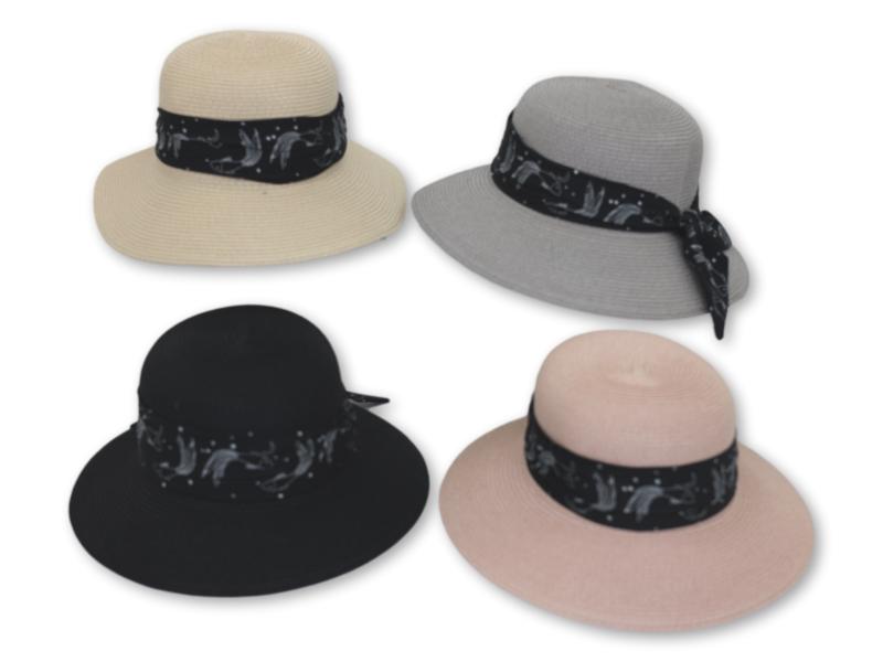 Sombrero elegante fabricado en tejido de poliéster, disponible en colores neutros como beige, gris, negro y rosa pálido. Cada pieza está decorada con una cinta negra estampada en blanco con motivos de estrellas y cometas, que aporta un toque moderno y sofisticado. Perfecto para combinar con atuendos casuales o para eventos al aire libre.