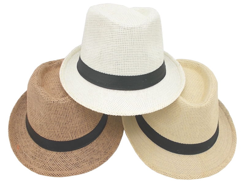 Sombrero estilo fedora confeccionado en material trenzado, ideal para un look casual o de playa. Disponible en tonos neutros como beige, marrón y blanco natural, todos con cinta negra de adorno. Su diseño ligero y transpirable lo hace perfecto para protegerse del sol sin perder estilo. Viene en un pack de 12 unidades combinadas en los colores mostrados en la imagen.