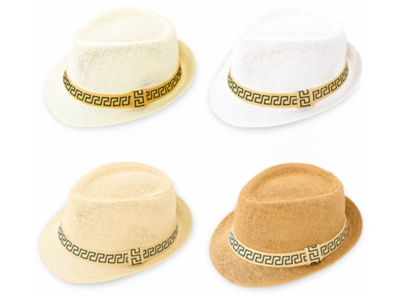 Sombrero estilo corto, fabricado en material ligero, decorado con cinta de diseño griego en color dorado. Ideal para looks casuales de verano o eventos al aire libre.