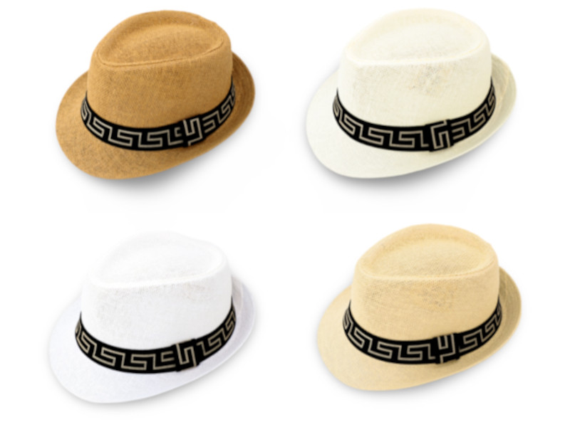 Sombrero tipo fedora de ala corta, elaborado en material fresco y adornado con cinta de patrón griego clásico. Ideal para eventos, playa y uso urbano en verano.