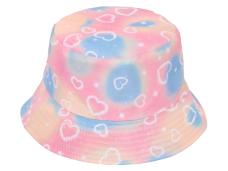 Un diseño encantador para niñas que sueñan en colores. Este sombrero bucket presenta un estampado de corazones sobre una mezcla suave de tonos pastel en rosa, azul y melocotón.