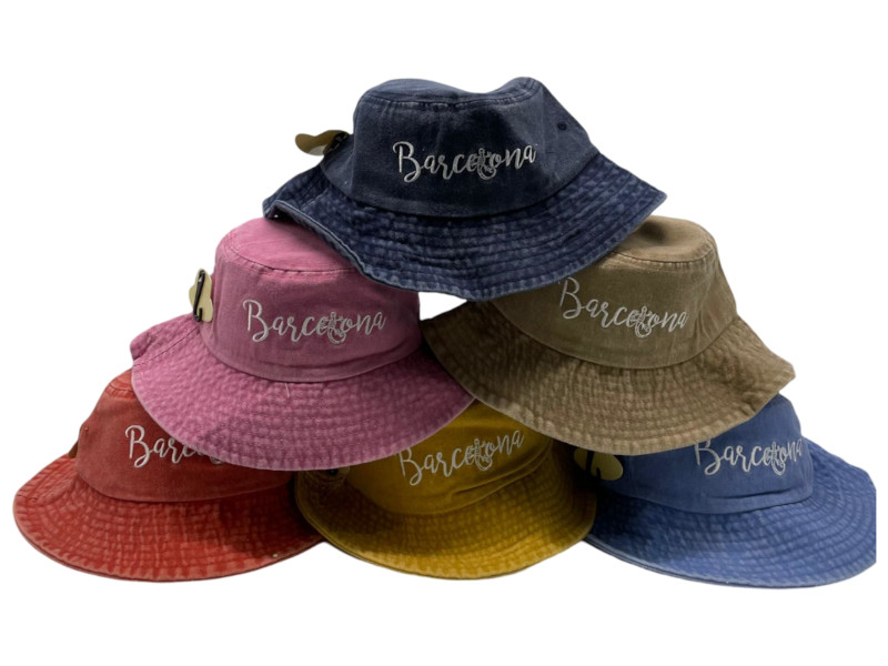 Lote de 24 sombreros tipo pescador en tonos desgastados estilo vintage: azul marino, rosa viejo, caqui, mostaza, teja y azul claro. Cada sombrero lleva bordado el nombre Barcelona con un diseño elegante y moderno.