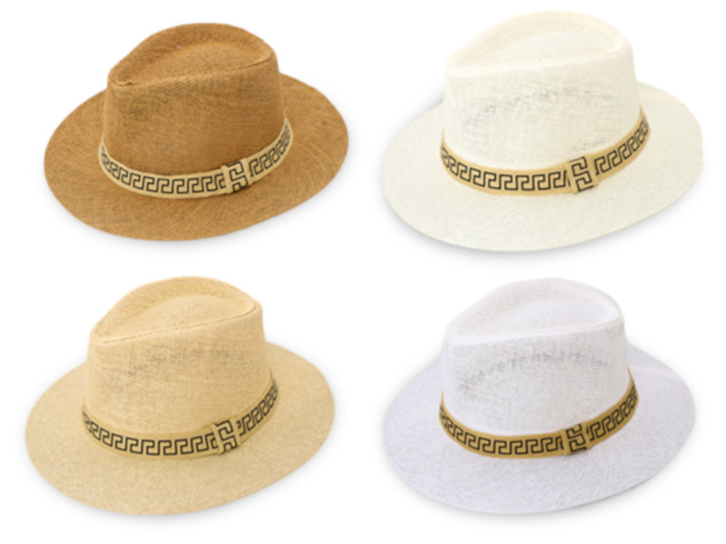 Sombrero tipo Panamá de material ligero con cinta decorativa de diseño clásico en tono dorado. Un complemento ideal para días soleados, eventos al aire libre y estilos de verano.