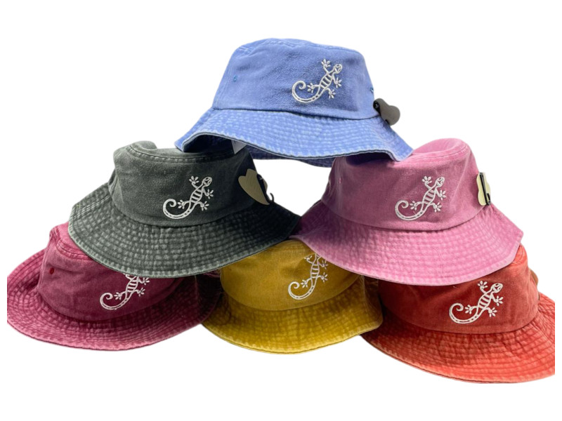 Gorro estilo bucket efecto lavado, decorado con bordado de lagartija en color blanco. Diseño veraniego, disponible en varios colores vibrantes, perfecto para un look casual o de playa.