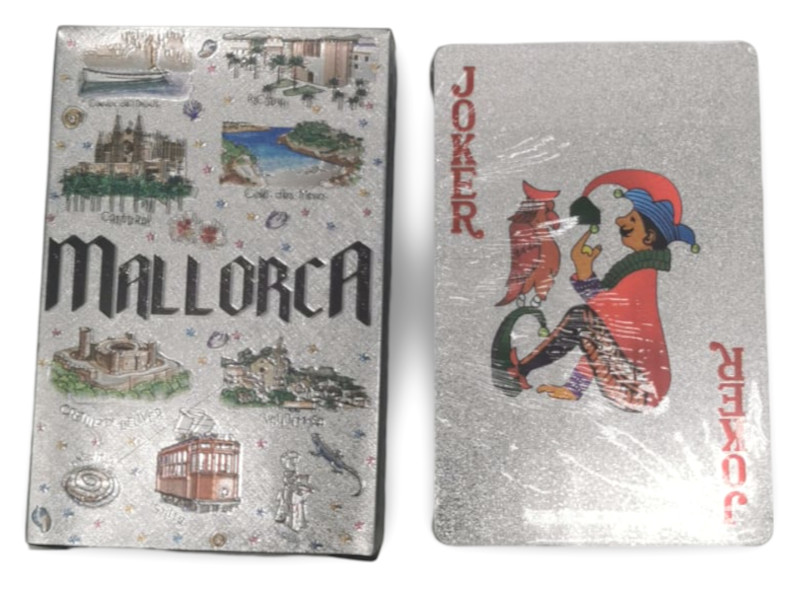 Baraja de cartas con temática de Mallorca, acabada en efecto plateado brillante. Incluye ilustraciones de lugares emblemáticos y detalles coloridos. Ideal como recuerdo o para jugar al póker. Pack: 12 unidades.