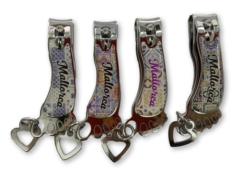 Original cortaúñas con forma de pie y decorado con motivos mallorquines. Incluye colgante en forma de corazón. Un detalle simpático y práctico con acabado metálico brillante.