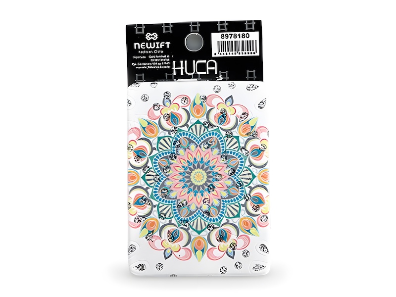 Espejo de bolsillo en formato rectangular con un mandala central en tonos pastel, que destaca sobre un fondo blanco decorado con pequeños detalles ornamentales. Su diseño simétrico y lleno de color ofrece un estilo alegre y armonioso, perfecto para añadir un toque artístico al día a día.
