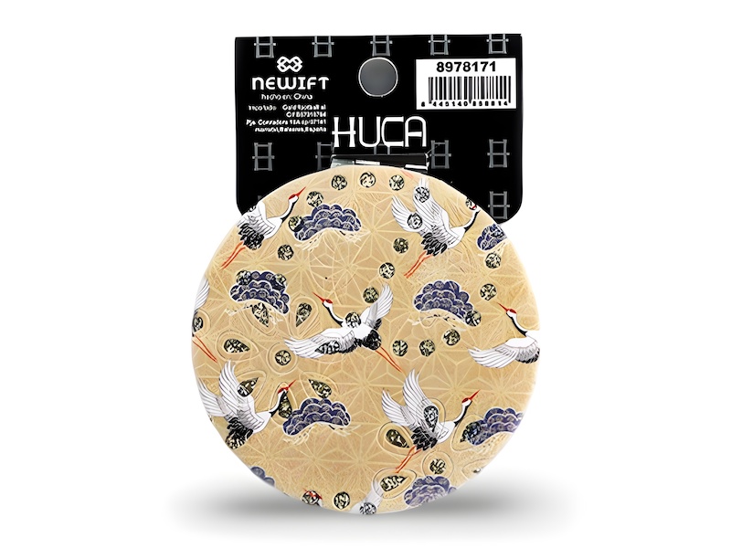 Espejo de forma circular con un diseño refinado que presenta grullas en pleno vuelo, acompañadas de nubes y motivos florales sobre un fondo en tonos dorados. Una pieza delicada de estética oriental, ideal como detalle decorativo y práctico para el día a día.