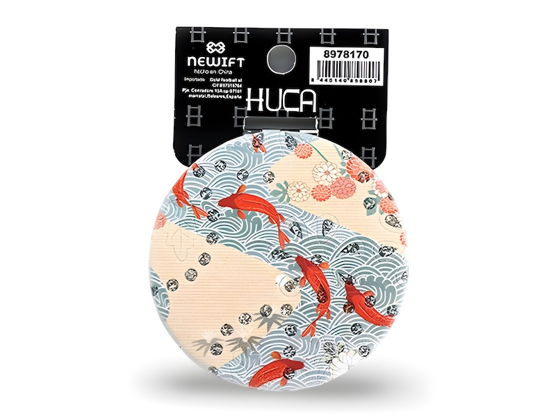 Elegante espejo compacto decorado con un diseño de inspiración japonesa, que combina olas estilizadas, flores tradicionales y carpas koi en tonos rojos y coral. Su estética armoniosa lo convierte en un accesorio funcional con un toque artístico y exótico.