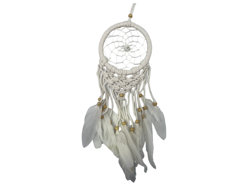 Atrapasueños artesanal de 12 cm decorado con una caracola natural en el centro, símbolo de conexión con el mar y la energía positiva. Tejido a mano con hilo blanco, plumas blancas y cuentas de madera. Ideal para ambientes relajantes y decoración boho.