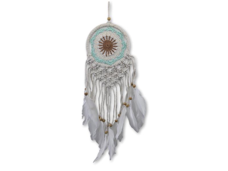 Este atrapasueños de 12 cm presenta un mandala central en tonos tierra con bordes turquesa, evocando calma y naturaleza. El diseño incluye plumas blancas y cuentas de madera natural, ideal para aportar un aire artesanal y armonioso a cualquier espacio.