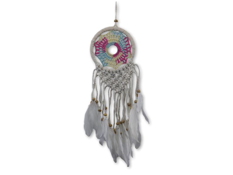 Este atrapasueños de 12 cm destaca por su original mandala de hilo en colores vivos como rosa, azul y amarillo, con un diseño circular abierto en el centro. Ideal para quienes buscan un toque bohemio y alegre en la decoración. Las plumas blancas colgantes y las cuentas de madera completan su estilo artesanal y luminoso.