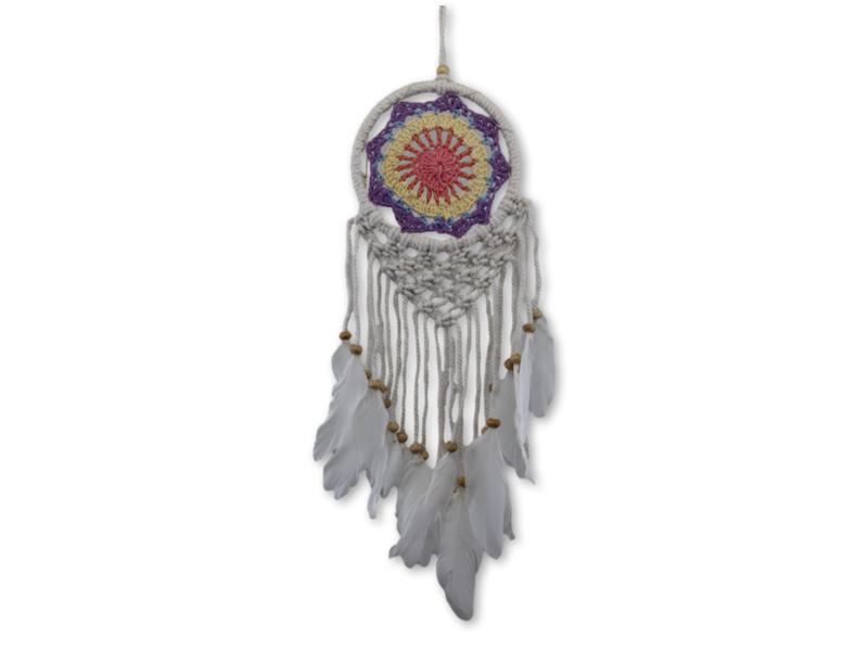 Este atrapasueños de 12 cm presenta un mandala artesanal con una llamativa combinación de colores como púrpura, amarillo, naranja y azul, resaltando sobre una base tejida en hilo blanco. Decorado con plumas blancas suaves y cuentas de madera, aporta un estilo místico y colorido, ideal para espacios boho o relajantes.