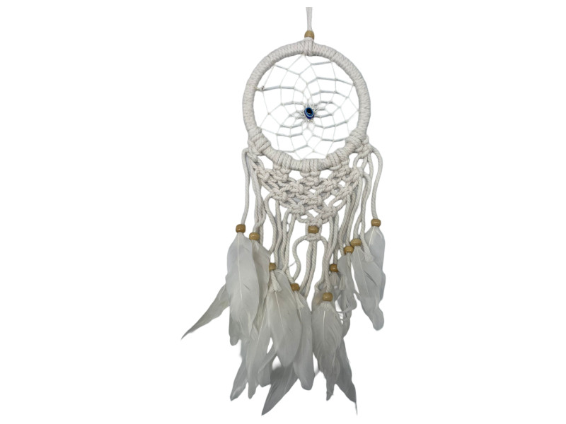 Atrapasueños artesanal de 12 cm con amuleto central de ojo turco azul, símbolo protector contra el mal de ojo. Confeccionado en hilo blanco, adornado con cuentas de madera y plumas blancas. Perfecto para espacios de descanso o meditación.