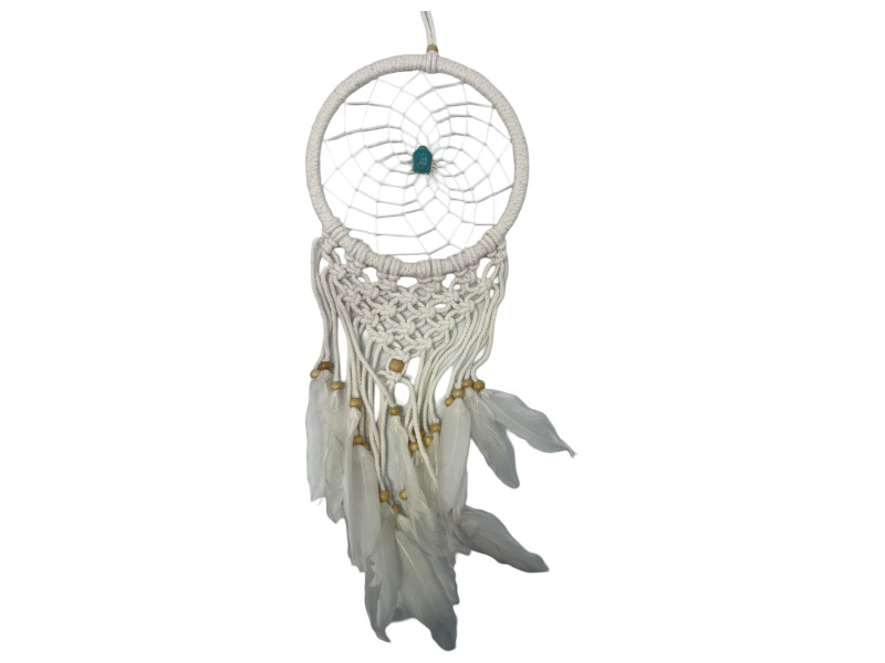 Atrapasueños de 16 cm con figura central de Buda en color turquesa, símbolo de paz interior y sabiduría. Elaborado artesanalmente con cuerda blanca, plumas naturales y cuentas de madera. Ideal para ambientes de meditación o como elemento decorativo espiritual.