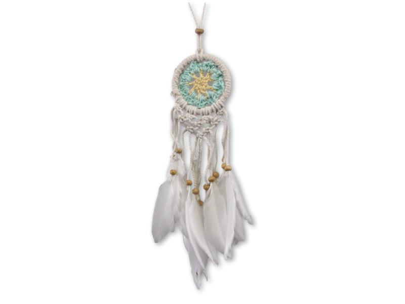 Atrapasueños verde agua y beige con plumas blancas 6 cm