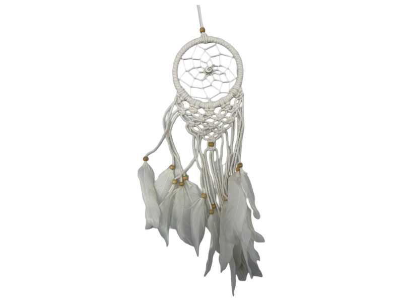 Este atrapasueños de 9 cm presenta una caracola natural en el centro de su red tejida a mano, símbolo de conexión con el mar, protección y calma interior. El aro está forrado en hilo blanco, acompañado de un delicado entramado de macramé del que cuelgan suaves plumas blancas decoradas con cuentas de madera clara. Una pieza con esencia costera y espiritual, ideal para decorar espacios relajantes o regalar con intención simbólica.