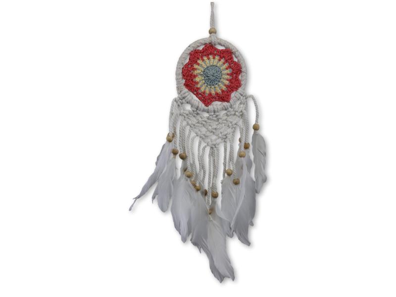 Atrapasueños de diseño artesanal con un vistoso centro en tonos rojo, amarillo y azul, rodeado por una estructura de cuerda blanca tejida a mano. Decorado con plumas blancas y bolas de madera que le dan un aire étnico y cálido. Ideal para dar vida a cualquier espacio interior.